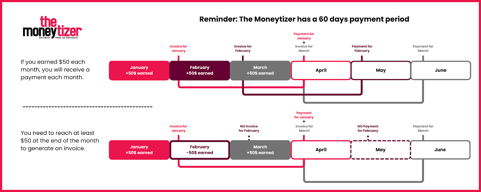 Unser Zahlungssystem ist vollautomatisch und basiert auf einer Mindestauszahlungsschwelle von 50 Euro / Dollar. Sobald Sie diesen Betrag in einem bestimmten Monat erreicht haben, wird am 10. des Folgemonats eine Rechnung generiert und 60 Tage später gesendet. Wenn Sie die Schwelle nicht erreichen, werden Ihre Einnahmen einfach auf den nächsten Monat übertragen.