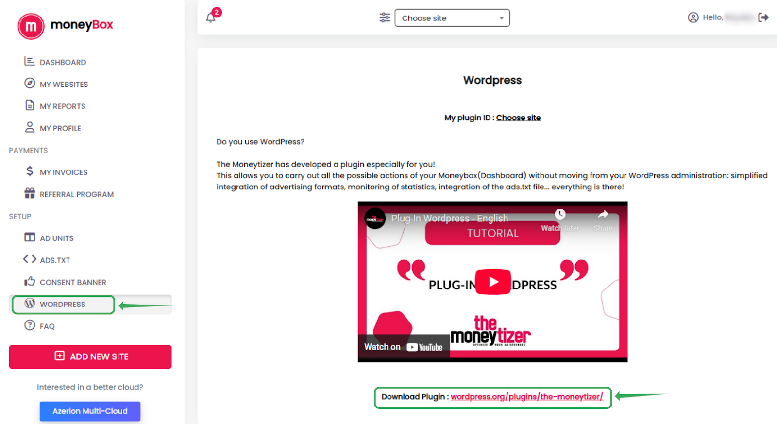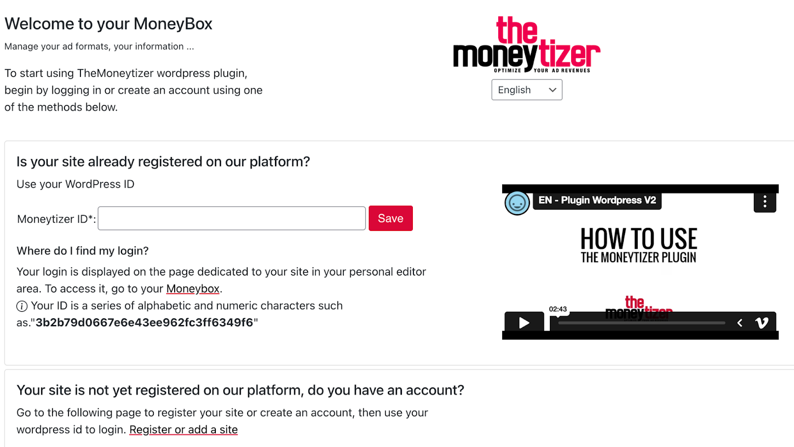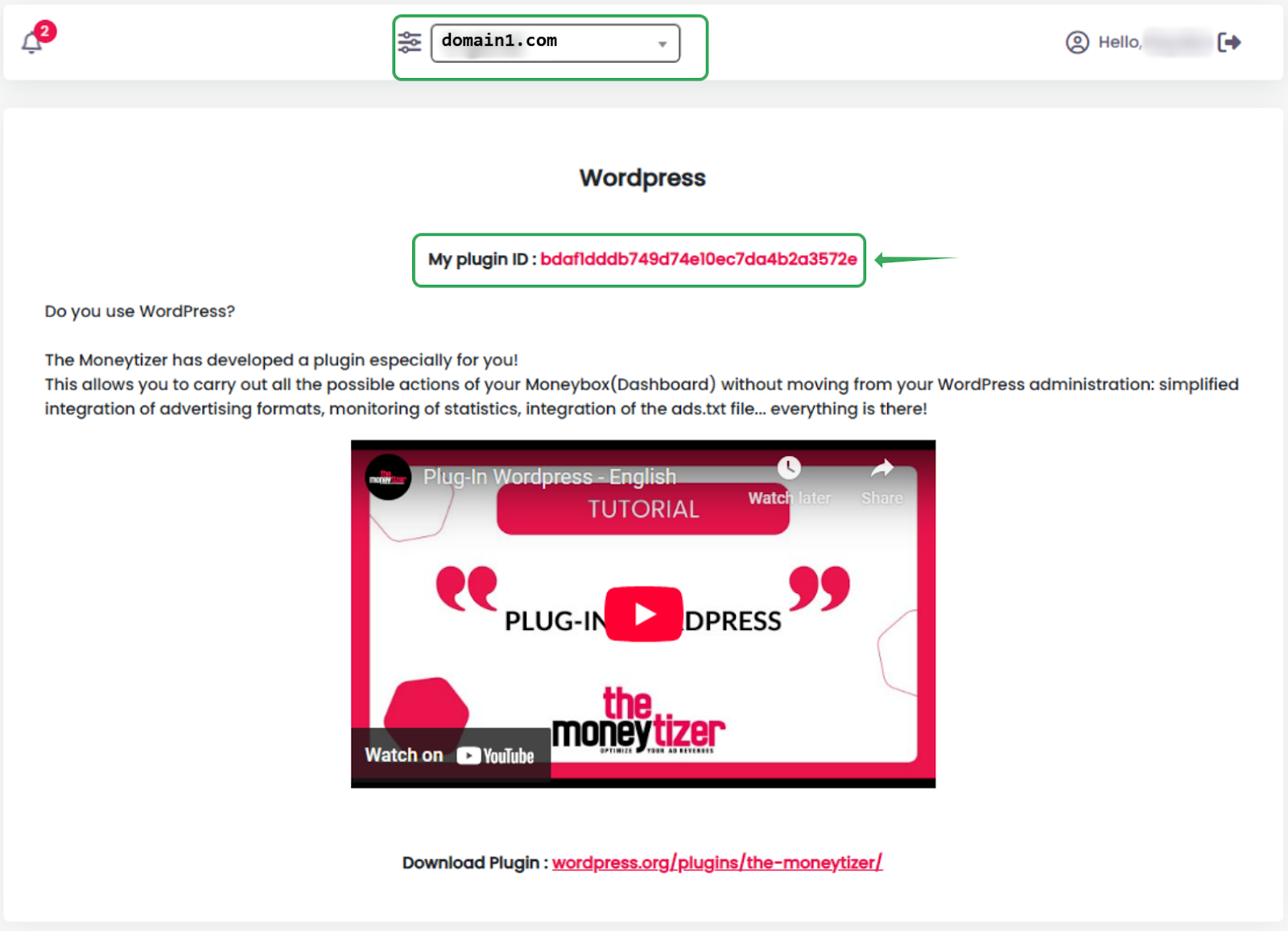 To securely connect your WordPress site with your Moneytizer account, you'll need a unique identifier: your "My plugin ID." This is found inside your publisher dashboard, known as the Moneybox.