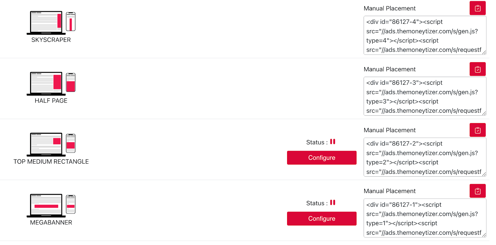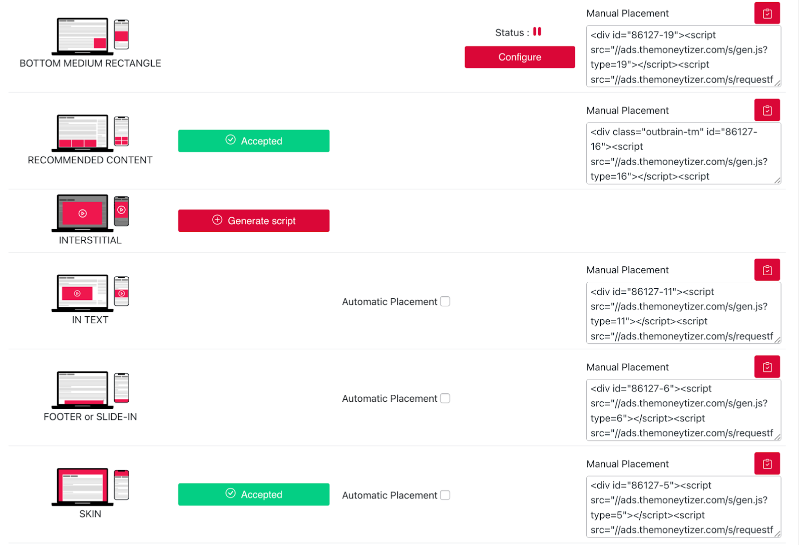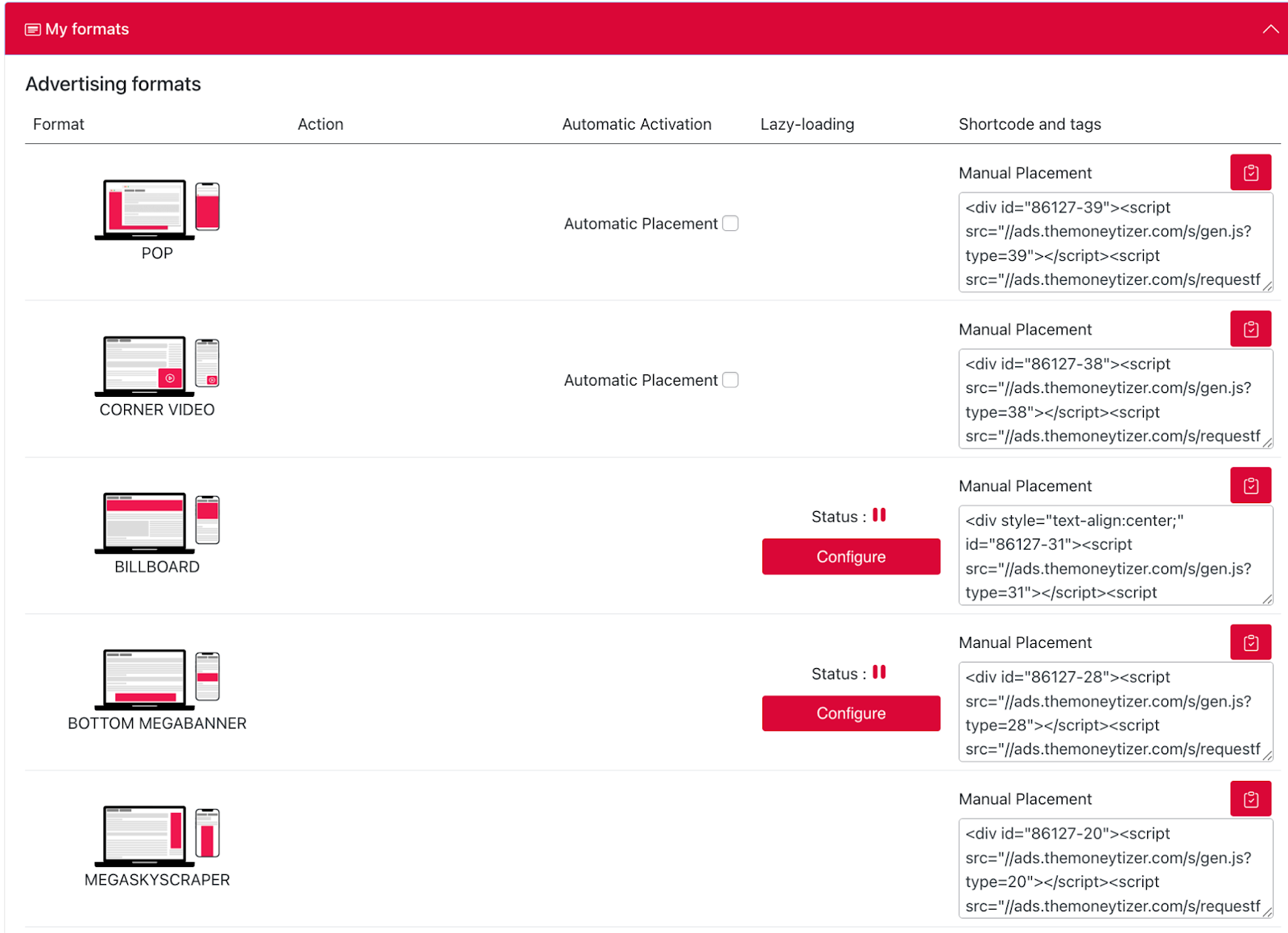 This section is where you discover and configure all available advertising formats from The Moneytizer.
