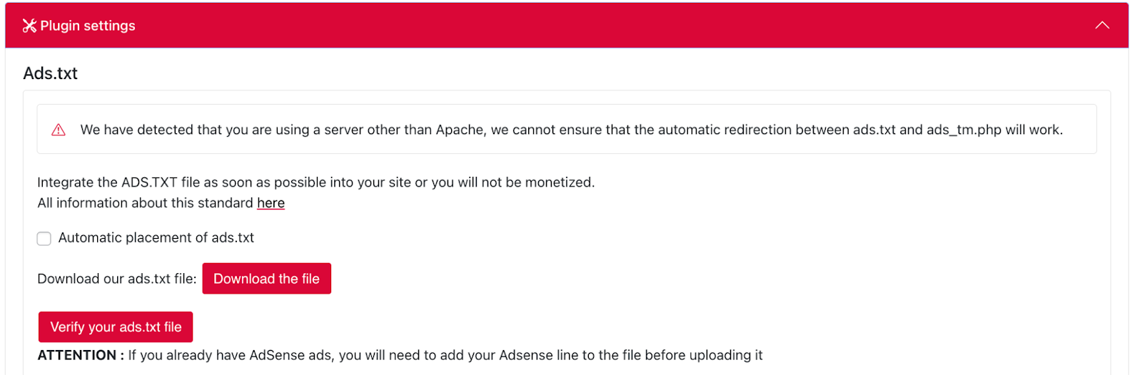 -Automatic placement of ads.txt: Check this option to have the plugin automatically manage and place the ads.txt file on your site. This is the easiest way to ensure compliance.