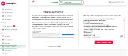 IMPORTANT: In the event that the consent banner is correctly displayed on your site but the validation fails to complete in your Moneybox, please contact us at contact@themoneytizer.com. We will inspect your site and validate it if everything is correct.