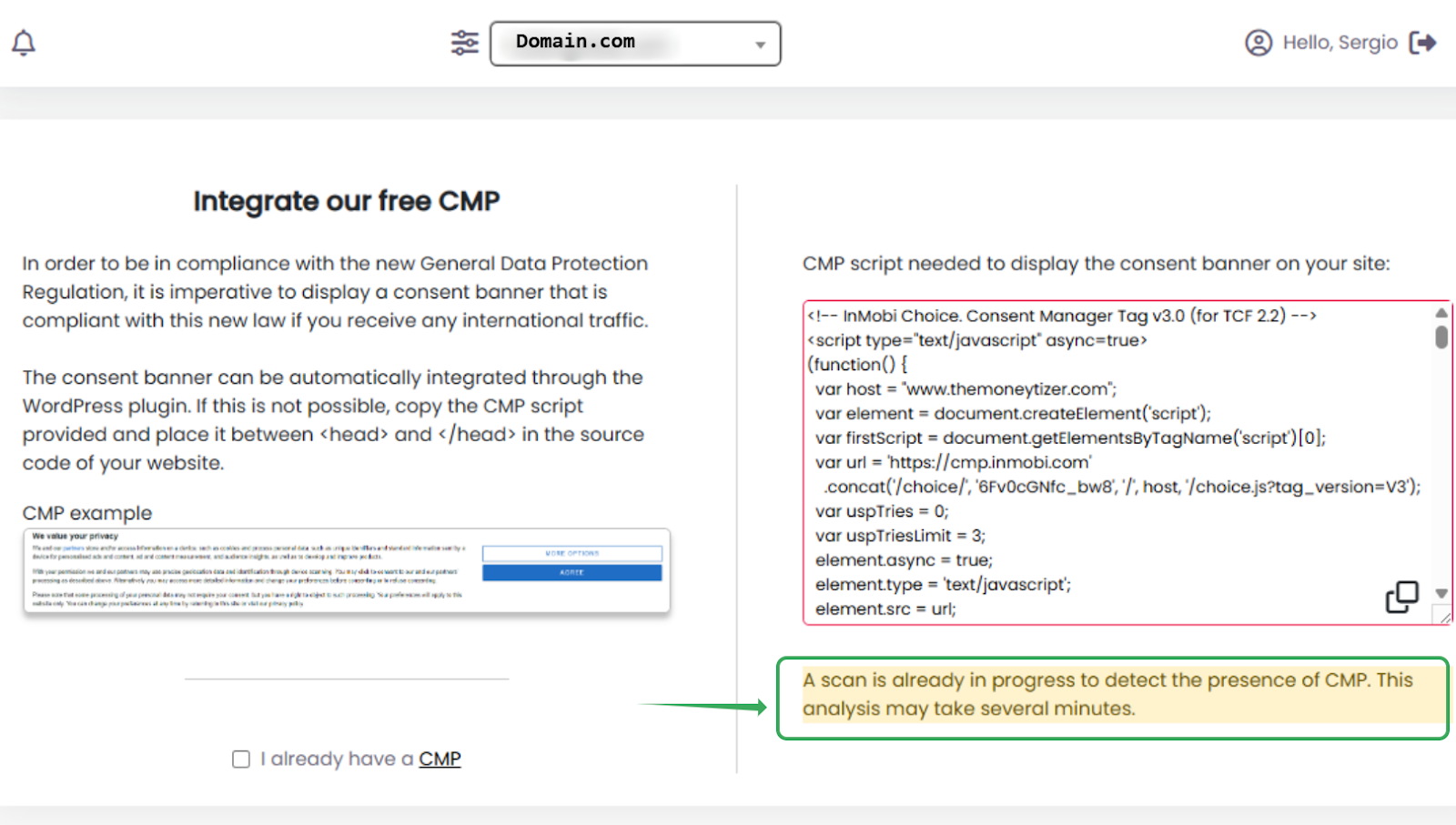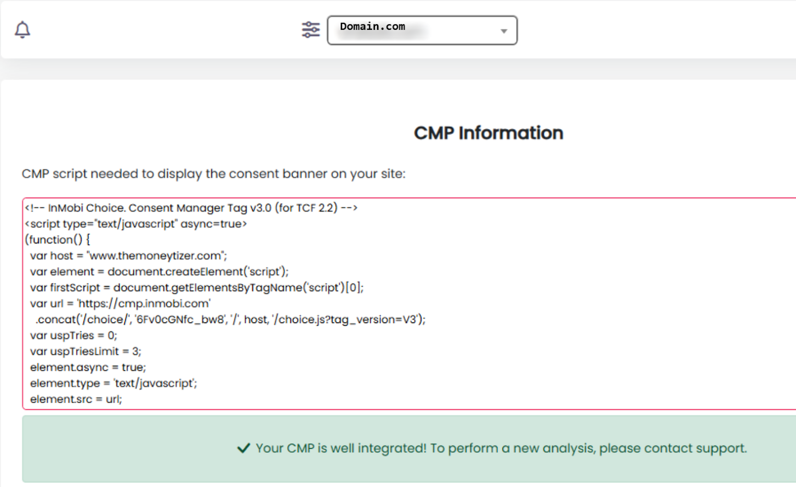 When the validation is successful, a confirmation message will appear stating, "Your CMP is well integrated!"