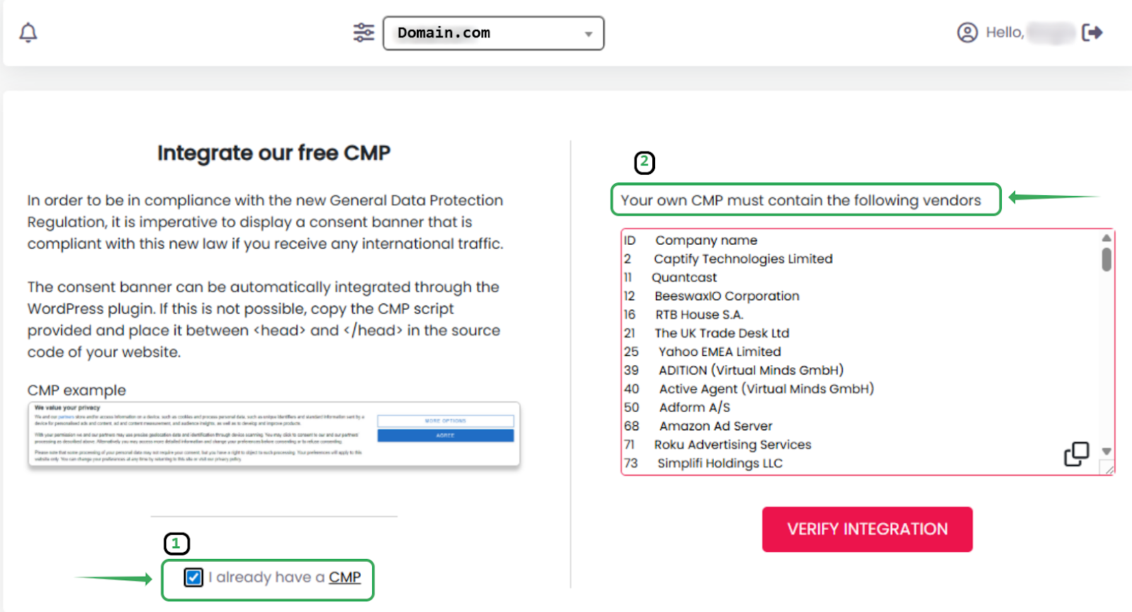 After you have added the vendors to your CMP, you can click the "VERIFY INTEGRATION" button to confirm the changes.