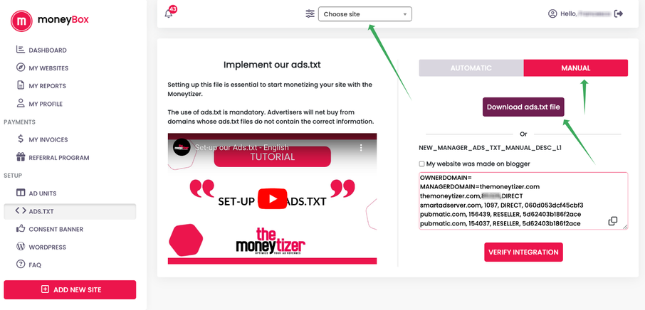 - Then, click on the "VERIFY INTEGRATION" button on your Moneytizer dashboard.