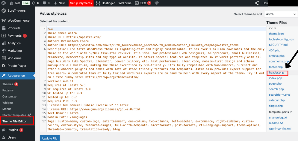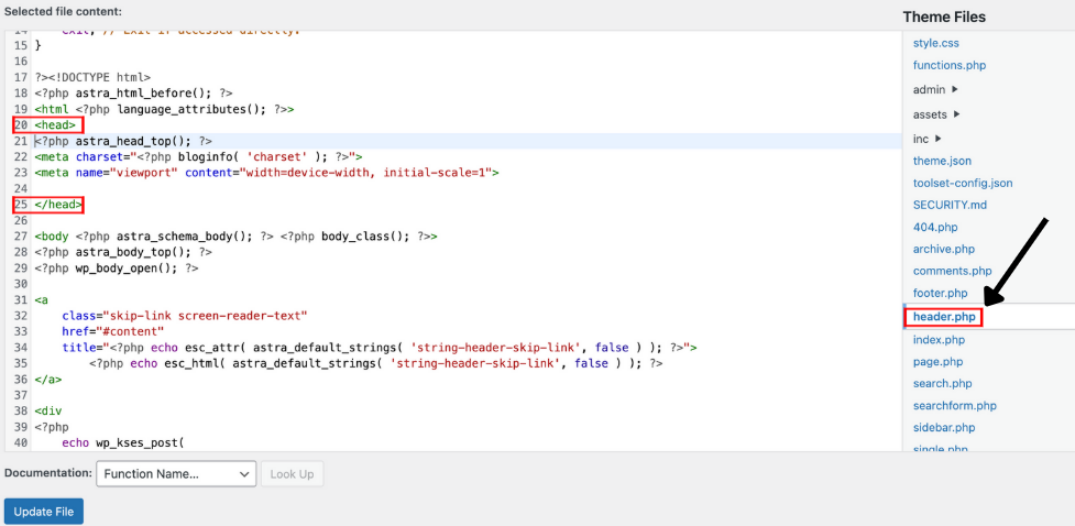 On the right-hand side, under "Theme Files," find and click on the header.php file.