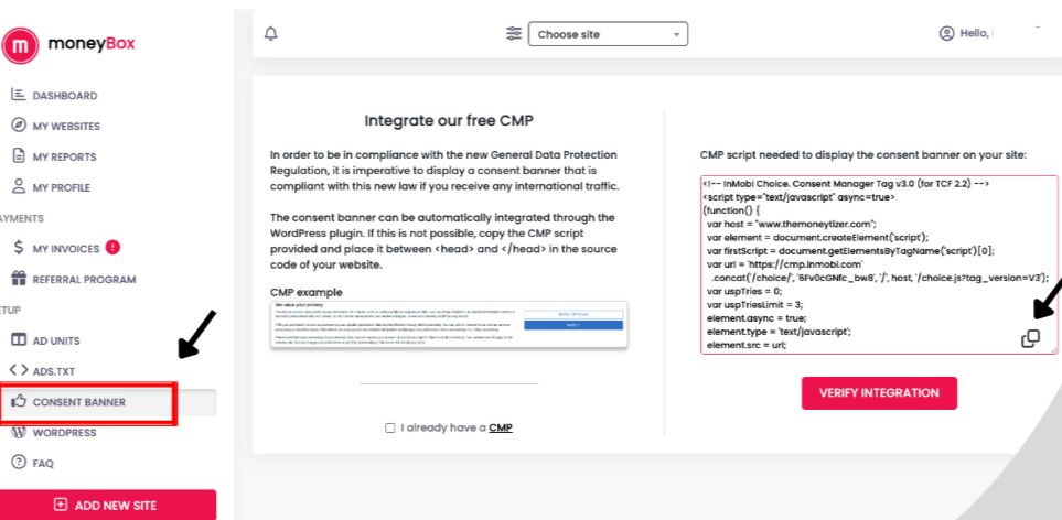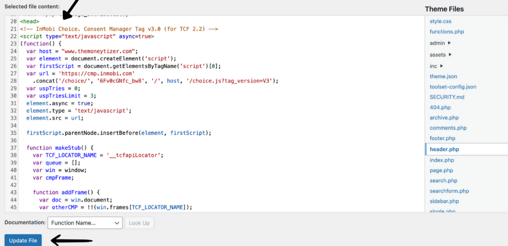 This guide provides step-by-step instructions on how to manually integrate The Moneytizer's Consent Management Platform (CMP) script on a WordPress website using the theme editor. This method is an alternative to using a plugin and ensures compliance with data protection regulations by displaying a consent banner on your site.