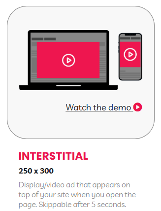 A full-screen display/video unit that appears on top of your page (commonly at first page open). It’s closable after a short delay to prevent accidental clicks.