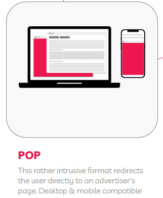 Pop (pop-up / pop-redirect): opens advertiser page directly; very visible, use sparingly.