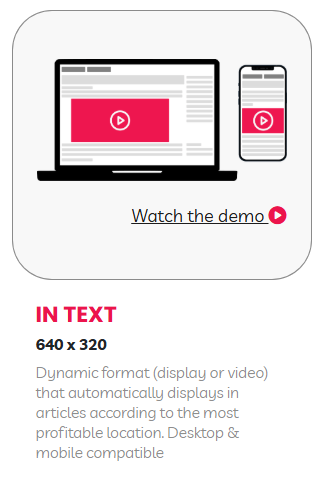 A video ad unit inserted between paragraphs. Autoplay is viewability-based (starts only when in view) and typically muted by default.